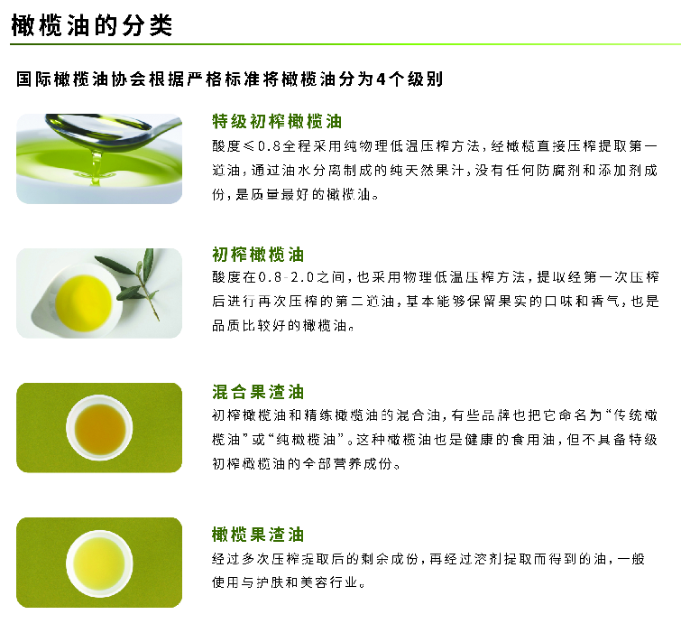 國際橄欖油協(xié)會根據(jù)嚴格標準將橄欖油分為4個級別: