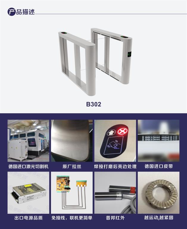 機(jī)場_速通門B302功能特點: 1. 進(jìn)口304不銹鋼; 2. 箱體激光切割加工; 3. 精焊,精磨工藝; 4. 表面原廠拉絲; 5. 紅外防夾保護(hù); 6. 非法闖入紅外報警; 7. 刷卡開閘反向逆行報警; 8. 凈重:單機(jī)芯:45kg, 雙機(jī)芯:85kg;