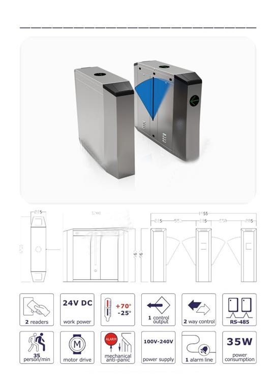 翼閘E242 1.尺寸:1200x280x960mm 2.解鎖時(shí)間: 0.2s 3.通行速度: 35 person/min 4.通道寬: ≤550mm 5.輸入電壓: 100V~240V 6.驅(qū)動電壓: 24v 7.環(huán)境溫度: -25~+70℃ 8.功率: 30w 9.開閘信號輸入: 干接點(diǎn) 10.產(chǎn)品包裝: 珍珠棉加紙箱 11.產(chǎn)品型號: