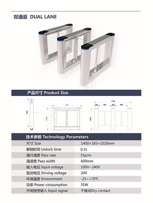 1、通道寬的范圍是所有閘機(jī)中_的,一般在550mm-1100mm之間,某些_產(chǎn)品可以做到1500mm,比較適合用于攜帶行李包裹的行人或自行車通行,也可以用作行動(dòng)不便者專用通道。